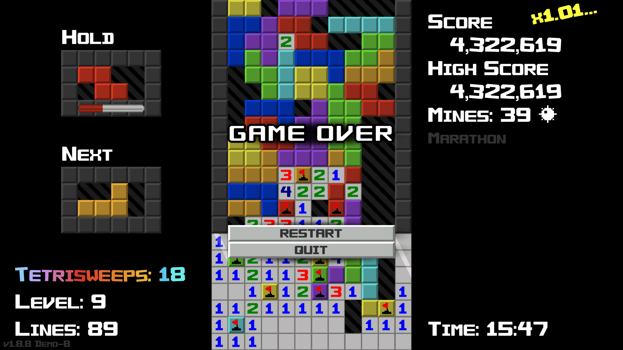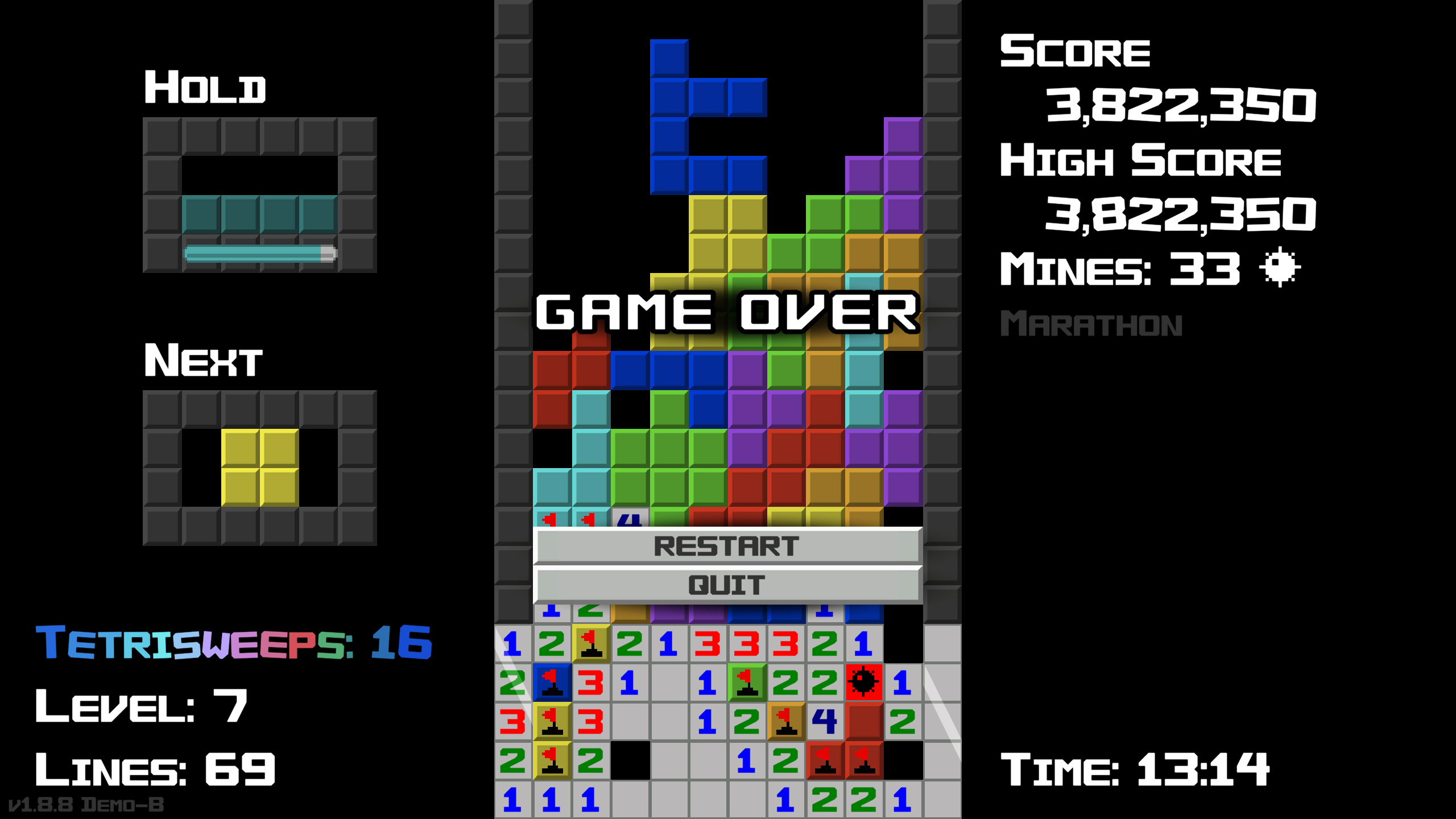 Also I learned to play around it normally (all you need is to not use the hold after a T-Spinsweep gets cleared) but there was this other weird bug I found where I think a piece turned invisible? Other blocks couldn't move into it, and its mines evidently still existed.