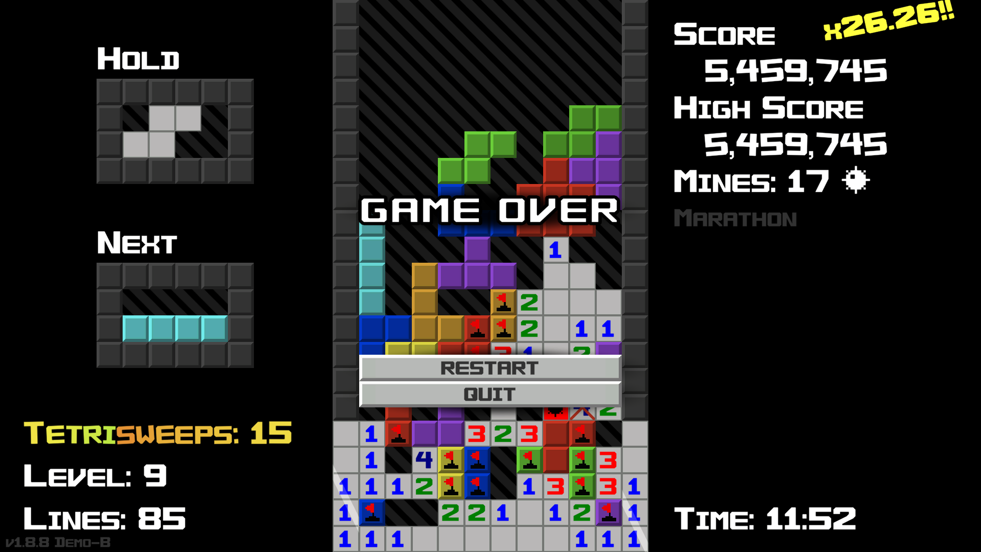 amazing concept! surprisingly addictive as well, got a highscore of 10,294 points. The mix of puzzle elements from minesweeper and the stress of tetris is really enjoyable and offers a surprisingly good gameplay loop!